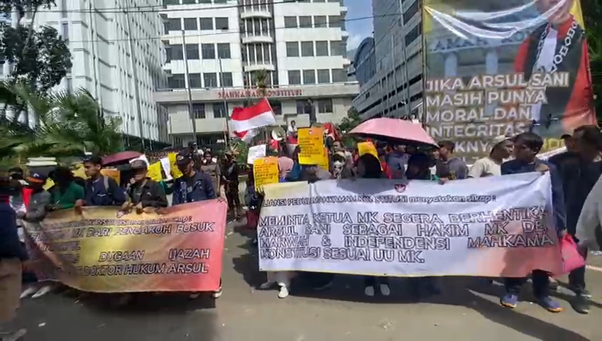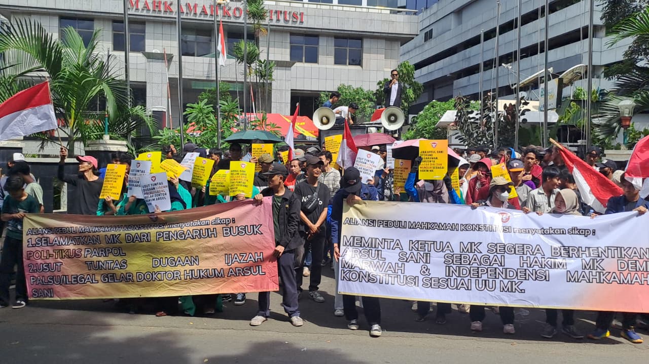 Jakarta – Aliansi Peduli Mahkamah Konstitusi (APMK) kembali menggelar aksi demonstrasi di depan Gedung Mahkamah Konstitusi (MK) RI, Senin (17/11). Dalam aksi bertajuk Jilid II ini, massa menyuarakan desakan agar Hakim Konstitusi Arsul Sani diberhentikan dari jabatannya serta meminta aparat penegak hukum mengusut dugaan keabsahan ijazah doktor hukum yang dikaitkan dengan dirinya.