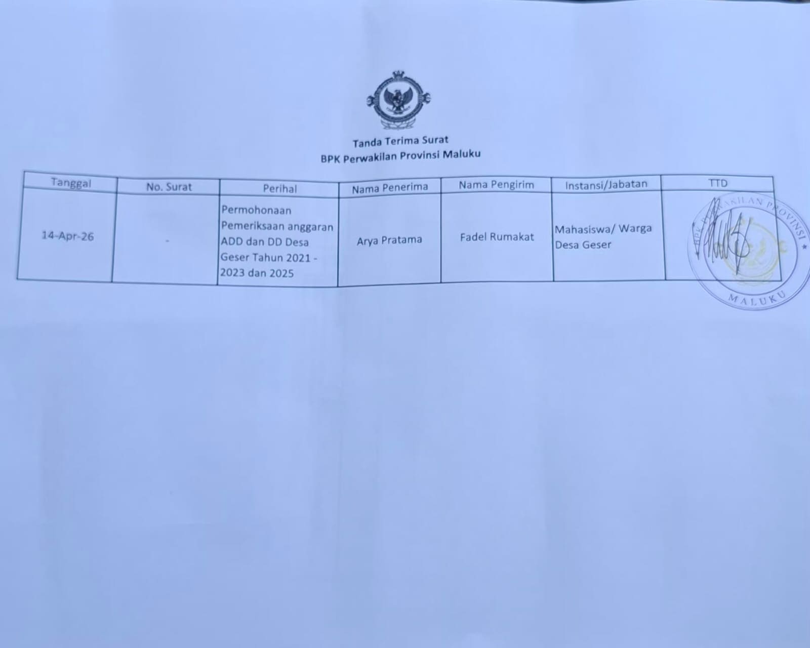 Ambon — FAKTAPLUS.ID, Dugaan adanya kegiatan fiktif dalam pengelolaan Alokasi Dana Desa (ADD) dan Dana Desa (DD) di Negeri Geser, Kecamatan Seram Timur, Kabupaten Seram Bagian Timur (SBT), kian menguat. Sejumlah warga pun akhirnya mengambil langkah resmi dengan menyurati Badan Pemeriksa Keuangan (BPK) RI Perwakilan Maluku untuk meminta dilakukan audit menyeluruh.