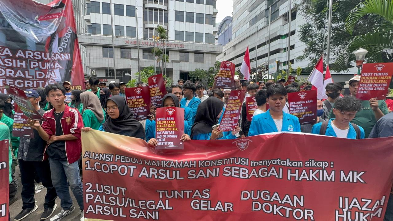 “Dalam penilaian kami, pengangkatan Arsul Sani sebagai Hakim MK telah menimbulkan polemik dan dinilai mencederai prinsip independensi MK. Ini bukan soal ada larangan atau tidak, tetapi soal etika, moralitas, dan integritas seorang hakim konstitusi,” ujar Amri dalam orasinya.