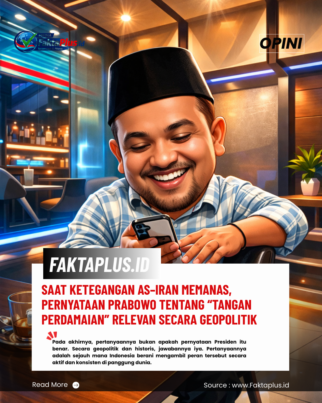JAKARTA—FAKTAPLUS.ID, Ketika ketegangan antara Amerika Serikat dan Iran kembali mengeras dan berpotensi meluas menjadi krisis global, pernyataan Presiden Prabowo Subianto di sejumlah media nasional menjadi relevan untuk ditimbang secara serius. Ia pernah menyatakan bahwa jika Indonesia dibutuhkan untuk menjadi tangan perdamaian dunia, maka Indonesia siap. Pernyataan itu bukan sekadar retorika diplomatik, melainkan refleksi dari posisi geopolitik Indonesia yang unik dalam percaturan global.